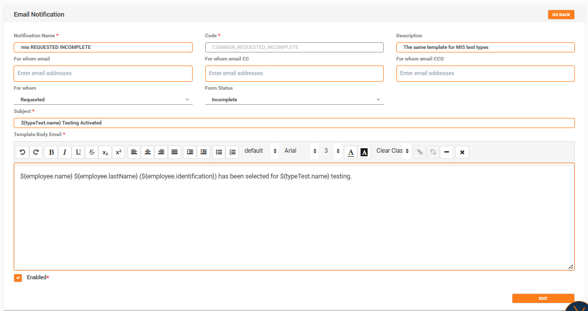 - Check Enabled if you want the notification active