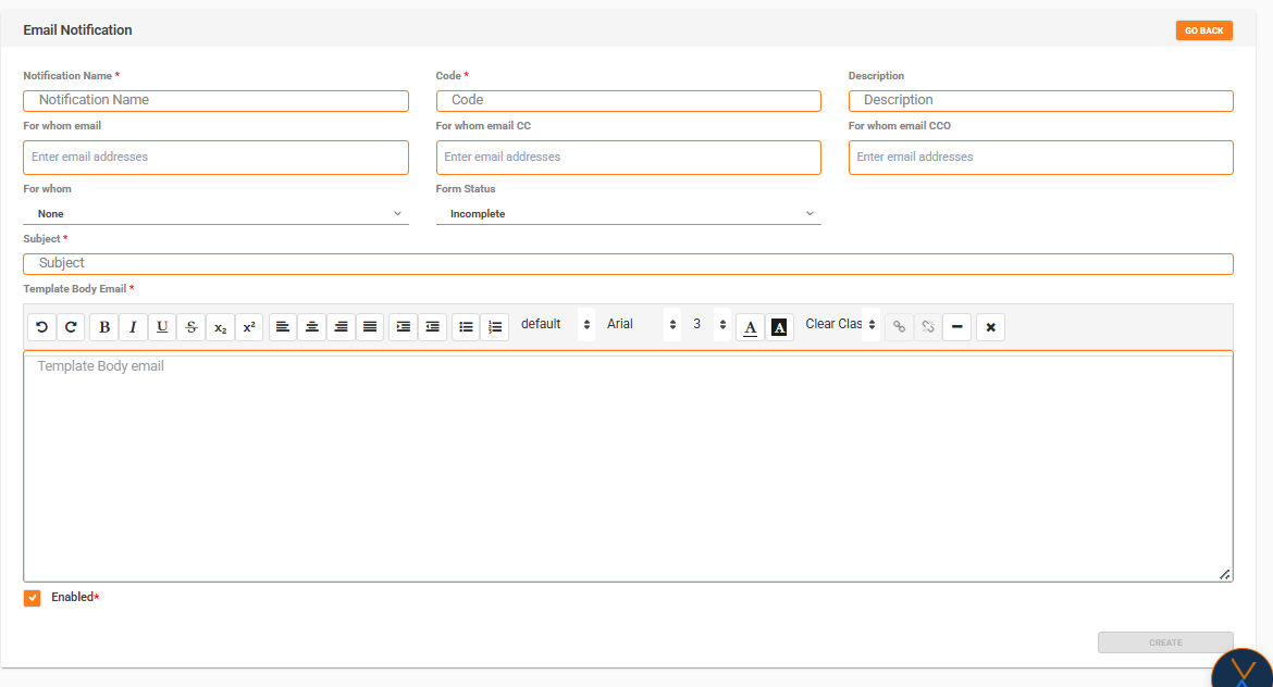 - Fill in all required fields (Name, Code, Subject, Template Body Email)