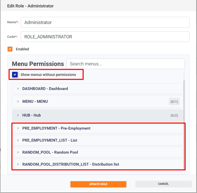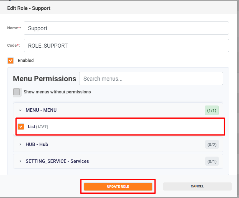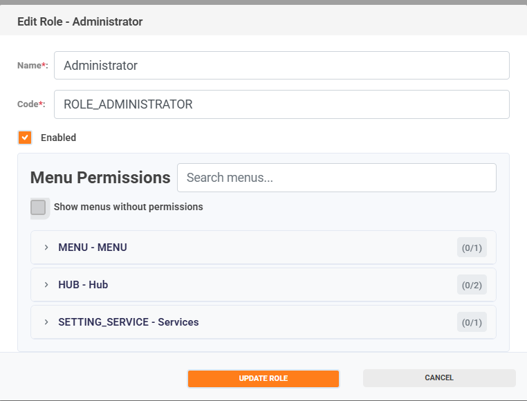 To assign permissions to a role, select the menu option; the available permissions will be displayed.
