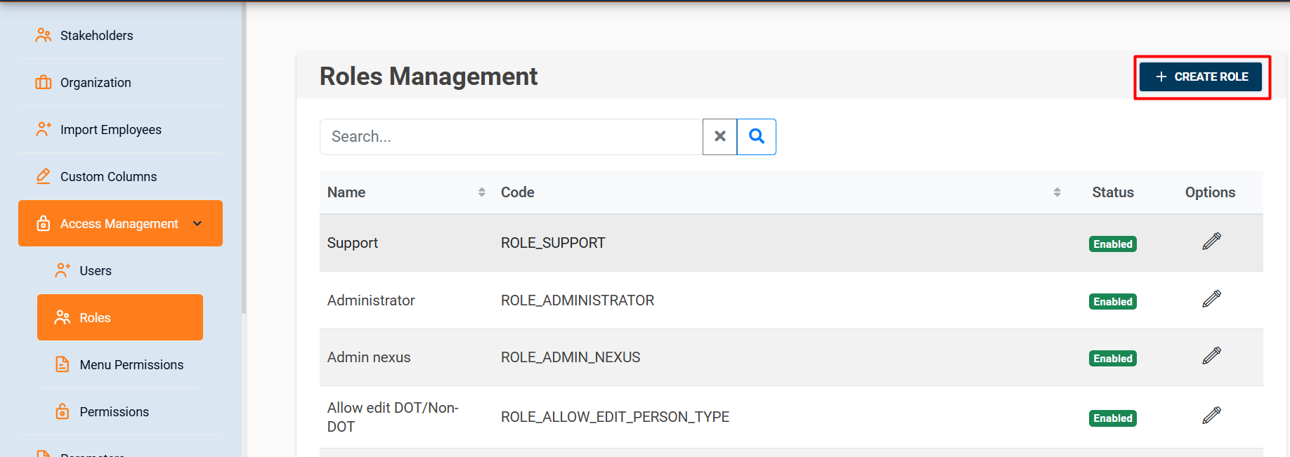 In the Roles section, you can create, edit, and list the roles that exist in the system.
