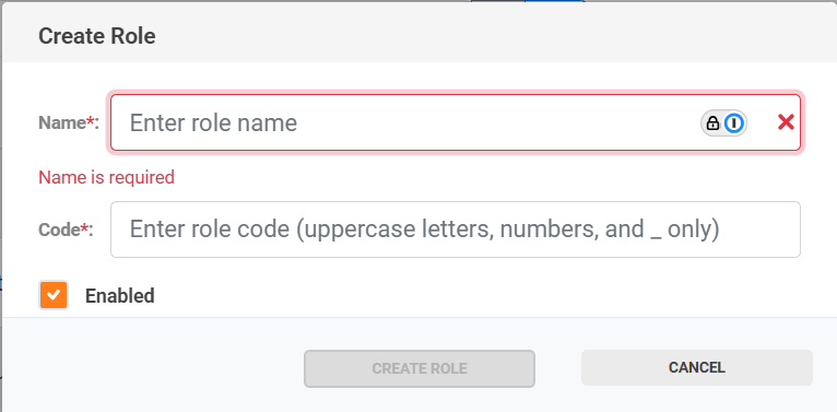 To create a role, you only need to provide the name and code. The code must be written in uppercase letters, and spaces must be replaced with underscores (_).