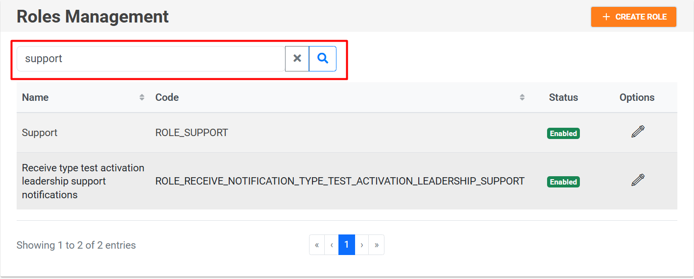 To search for a role, click on the magnifying glass icon 🔍, and to clear the filter, use the “X” icon.
